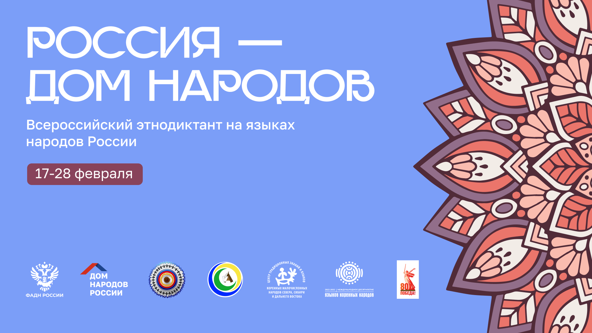 В преддверии Международного дня родных языков с 17 по 28 февраля в России пройдет Всероссийский этнодиктант «Россия — дом народов». Его будут писать как на общегосударственном русском языке, так и на языках с официальным статусом субъектов Российской Федерации. Проект реализуется Домом народов России и посвящен 80-летию Победы в Великой Отечественной войне.