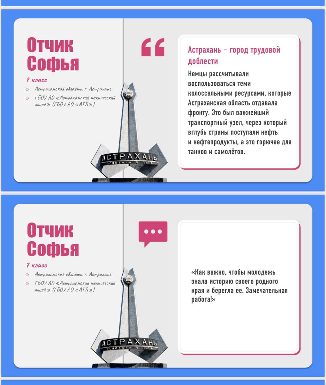 Софья Отчик написала работу на тему «Астрахань – город трудовой доблести». Она выбрала её вместе со своим классным руководителем, учителем русского языка и литературы Елизаветой Тиховой.