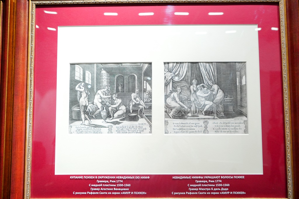 Выставка поделена на три тематических блока. Первый блок представлен 30 гравюрами с рисунков Рафаэля. Они иллюстрируют сюжет новеллы Луция Апулея «Амур и Психея» из романа «Метаморфозы, или Золотой осел», отпечатанные в Риме в 1774 году. Следующий блок содержит 52 литографии фресок Лоджий Ватикана, или Лоджий Рафаэля. Это полное собрание иллюстраций, оригиналы которых представлены в виде росписей, украшающих Папский дворец в Ватикане. Завершает экспозиционный ряд серия гравюр Людвига Грюнера с мозаик Рафаэля Санти для богатого купца Агостино Киджи. Эти работы посвящены познаниям людей той эпохи в астрологии и астрономии. На гравюрах можно увидеть божественные образы, планеты и созвездия, а также символы знаков зодиака. Оригиналы этих работ были нарисованы Рафаэлем и выложены в мозаике на куполе в капелле Киджи.