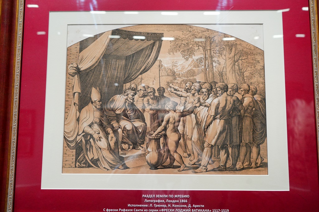 В экспозиционный ряд вошло свыше 90 предметов, среди которых гравюры и литографии с рисунков, фресок и мозаик Рафаэля Санти из частных собраний Великобритании и Германии.